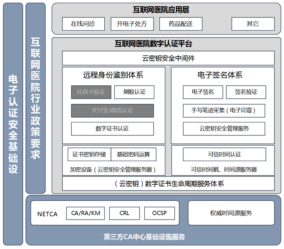 ● 云服務(wù):若互聯(lián)網(wǎng)醫(yī)院應(yīng)用系統(tǒng)本身也是在云端,不方便部署硬件設(shè)備的情況,網(wǎng)證通可提供云服務(wù)方式接入
