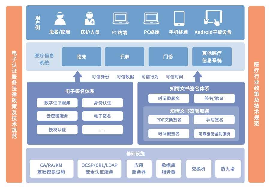 通過建設知情文書簽名體系,為知情文書的電子簽署提供安全可靠的網(wǎng)絡環(huán)境,通過人臉識別手段,對患者進行可靠的身份鑒別,網(wǎng)證通(第三方CA機構)為患者簽發(fā)數(shù)字證書,患者使用數(shù)字證書對知情文書進行電子簽名,從而實現(xiàn)知情文書的合法無紙化。