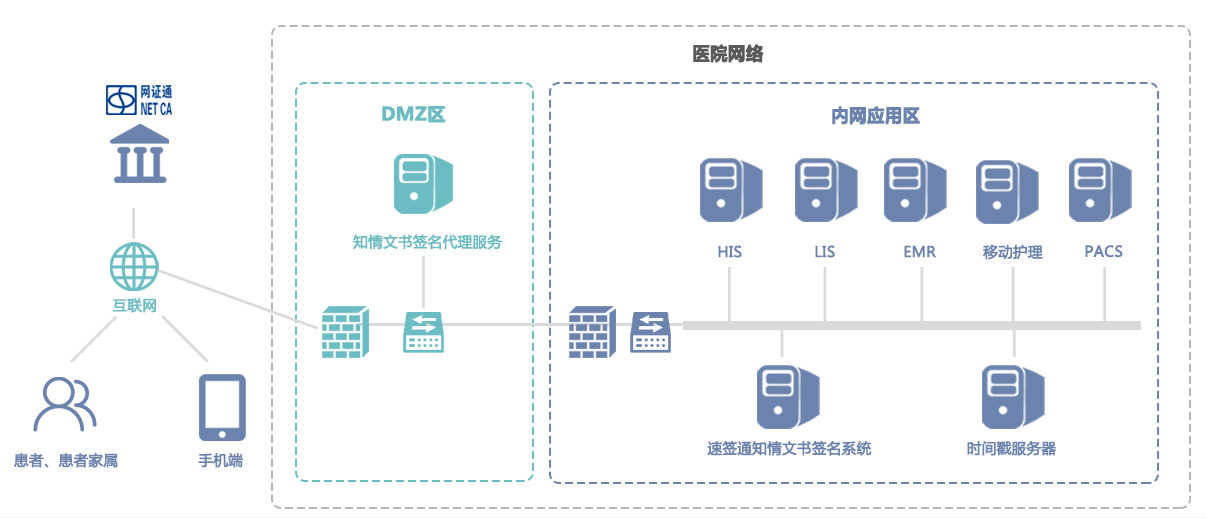 根據(jù)醫(yī)院的網(wǎng)絡情況,可在DMZ區(qū)部署一套速簽通知情文書簽名代理服務,用于連接在醫(yī)院內(nèi)外的各種醫(yī)療信息系統(tǒng),在內(nèi)網(wǎng)應用區(qū)部署速簽通知情文書簽名系統(tǒng)1套,時間戳服務器1臺。