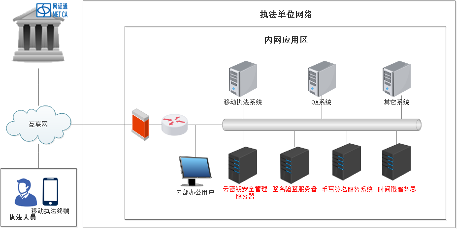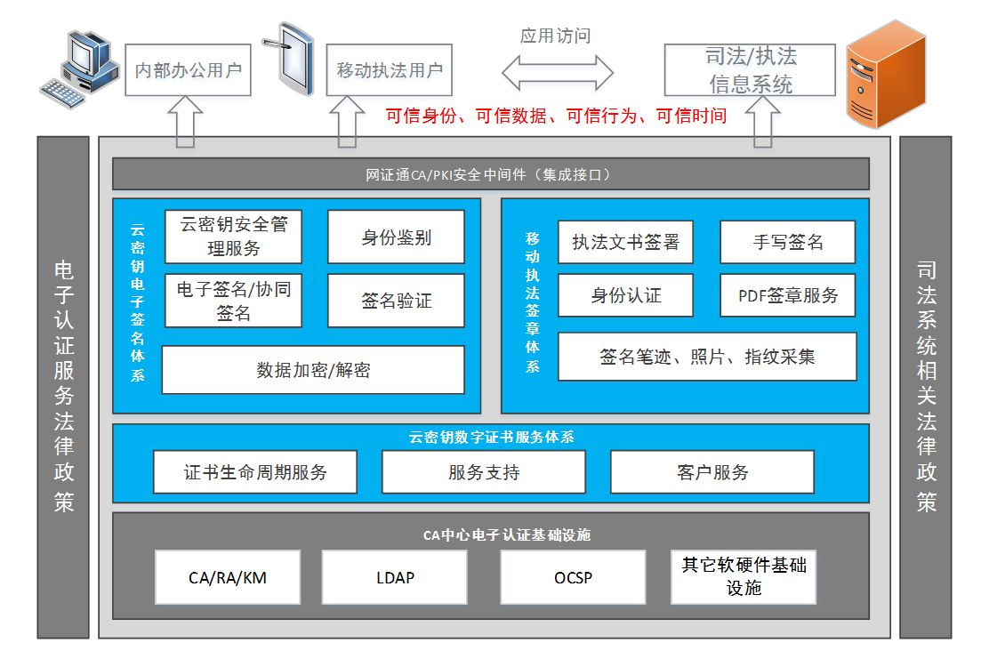 通過搭建云密鑰電子簽名體系,對執法單位內部辦公人員和外出執法人員的密鑰進行集中安全管理,同時依靠第三方合法CA機構提供的數字證書服務,兼容PC端應用和移動執法終端應用,實現司法業務系統全流程無紙化、合法化。
