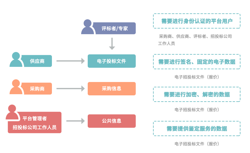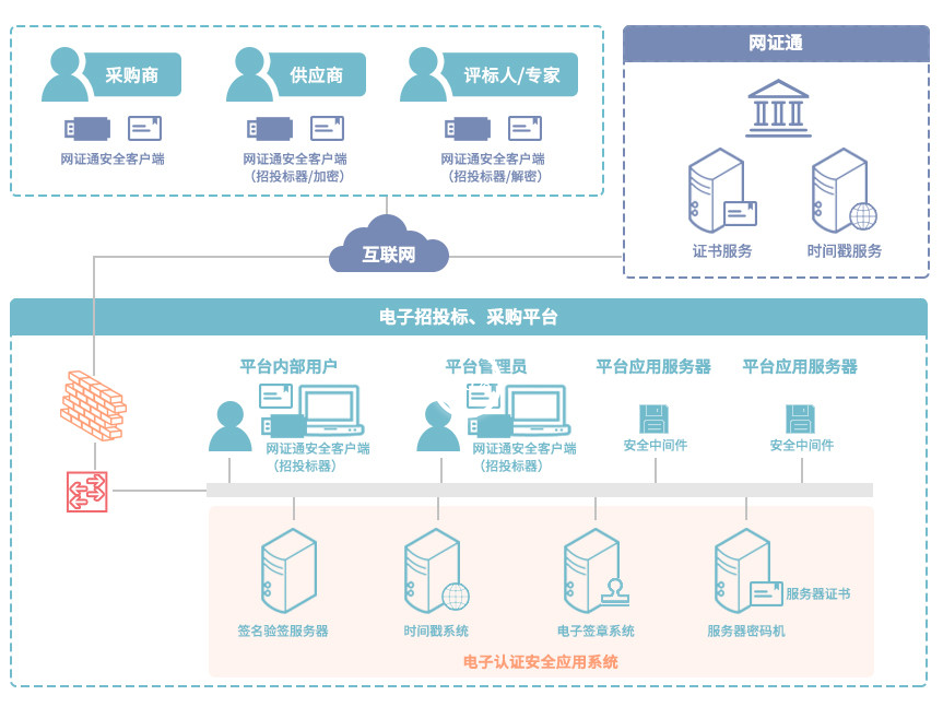 根據電子招投標行業的應用場景,在電子招投標系統所在網絡中部署簽名驗簽服務器、時間戳、服務器密碼機、電子簽章系統等電子簽名相關產品,并由合法的第三方CA機構為電子招投標相關方簽發數字證書,實現電子招投標過程中的可靠身份認證、電子簽名、數據安全、操作時間可信、專家遠程評標和中標通知書/電子合同的合法性需求。